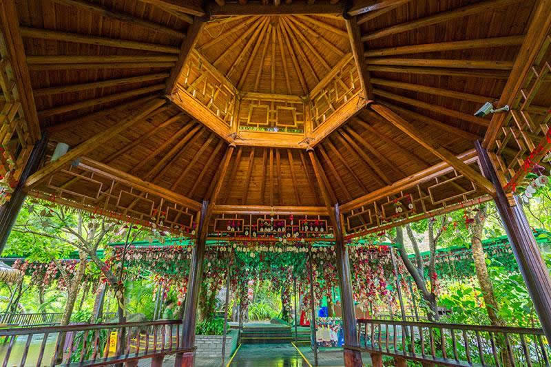 幸福桐亭是因亭子附近有三棵黃桐樹而命名的,桐亭周圍掛滿由黎族阿婆用觀音草編制而成的風(fēng)鈴,風(fēng)鈴上獨特的圖案是黎族的守護神“大力金剛神”,該圖案由牛頭和青蛙上下兩個部分組成。桐亭與幸福天道相連,幸福天道上有四道門:友情門、愛情門、親情門和幸福門。