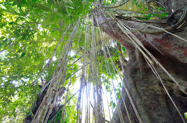 在呀諾達的雨林谷中,一根根、一條條的藤本植物交叉在一起,盤根錯節(jié),密如蛛網(wǎng),其間分布的幾株榕樹,如“定海神針”般地插在其中。