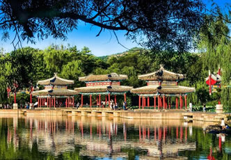 山巒區(qū):位于山莊西北部,面積443.5萬平方米。山區(qū)占了整個園林面積的五分之四。從西北部高峰到東南部湖沼、平原地帶,相對高差180米,形成了群峰環(huán)繞、色壑縱橫的景,山谷中清泉涌流,密林幽深。高聳的山峰好似天然屏障,阻擋了西北寒風(fēng)的侵襲,是調(diào)節(jié)山莊氣候的重要因素。當年利用山峰、山崖、山麓、山澗等地形,修建了多處園林、寺廟,共計40余處。