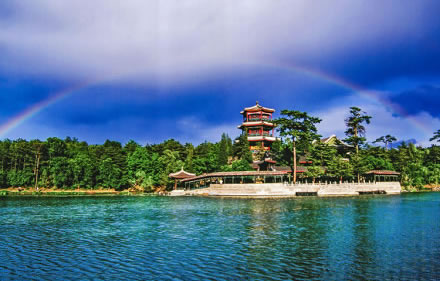 湖泊區(qū):苑景區(qū)的精華基本上在湖泊區(qū),康熙曾夸耀說,“天然風(fēng)景勝西湖”。由于洲島錯落,湖面被長堤和洲島分割成5個湖,各湖之間又有橋相通,兩岸綠樹成蔭,山莊主要的風(fēng)景建筑又都散落在湖區(qū)的周圍,因此顯得曲折有致,秀麗多姿。湖泊區(qū)位于山莊東南,面積49.6萬平方米。有大小湖泊八處,即西湖、澄湖、如意泅、上湖、下湖、銀湖、鏡湖及半月湖,統(tǒng)稱為塞湖。 湖區(qū)的風(fēng)景建筑大多是仿照江南的名勝建造的,如“煙雨樓”,是模仿浙江嘉興南湖煙雨樓的形狀修的。金山島的布局仿自江蘇鎮(zhèn)江金山。湖中的兩個島分別有兩組建筑,一組叫“如意洲”,一組叫“月色江聲”!叭缫庵蕖鄙嫌屑偕健鐾、殿堂、廟宇、水池等建筑,布局巧妙,是風(fēng)景區(qū)的中心。“月色江聲”是由一座精致的四合院和幾座亭、堂組成。每當月上東山的夜晚,蛟潔的月光,映照著平靜的湖水,山莊內(nèi)萬籟俱寂,只有湖水在輕拍堤岸,發(fā)出悅耳的聲音,“月色江聲”的題名便是由此而來。湖泊區(qū)集南方園林之秀和北方園林之雄,將江南園林的景觀移植到塞外。區(qū)內(nèi)湖泊總稱“塞湖”,總面積57公頃。