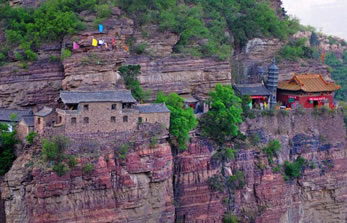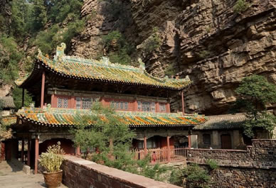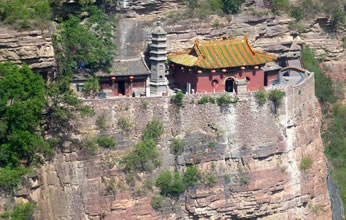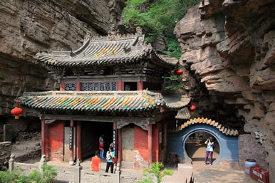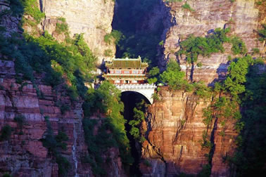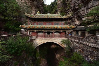 一絕“橋樓殿”。橋凌駕于百仞峭壁之間,仰視藍(lán)天一線,俯首萬丈深淵。形制如同趙州橋敞肩拱式。橋上建樓,云飛樓動(dòng),樓內(nèi)建殿,殿內(nèi)三尊大佛。真是“千丈虹橋望入微,天光云彩共樓飛”,不是仙境勝似仙境,疑是天堂落塵!,F(xiàn)為中國(guó)三大懸空寺之一。