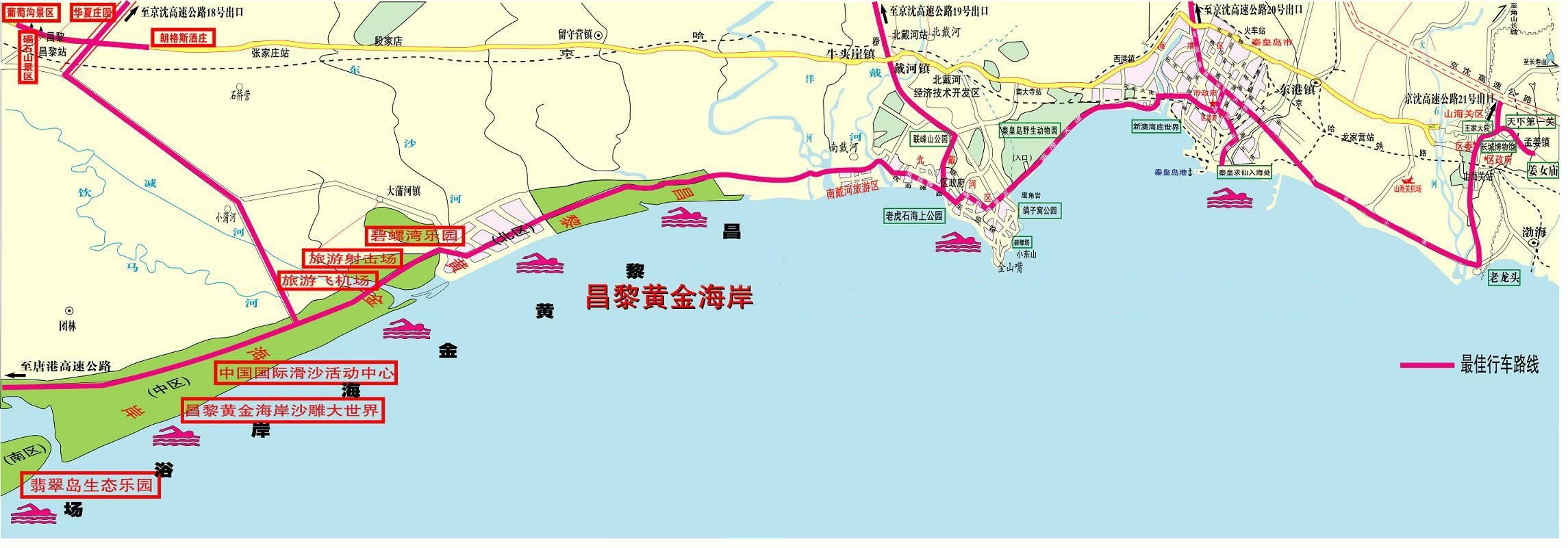 位于河北省昌黎縣東南面的渤海岸邊,海岸線全長52.1公里,具有沙細,灘軟,水清,潮平的特點,是進行海水浴、陽光浴、沙浴、森林浴、空氣浴的理想地點。