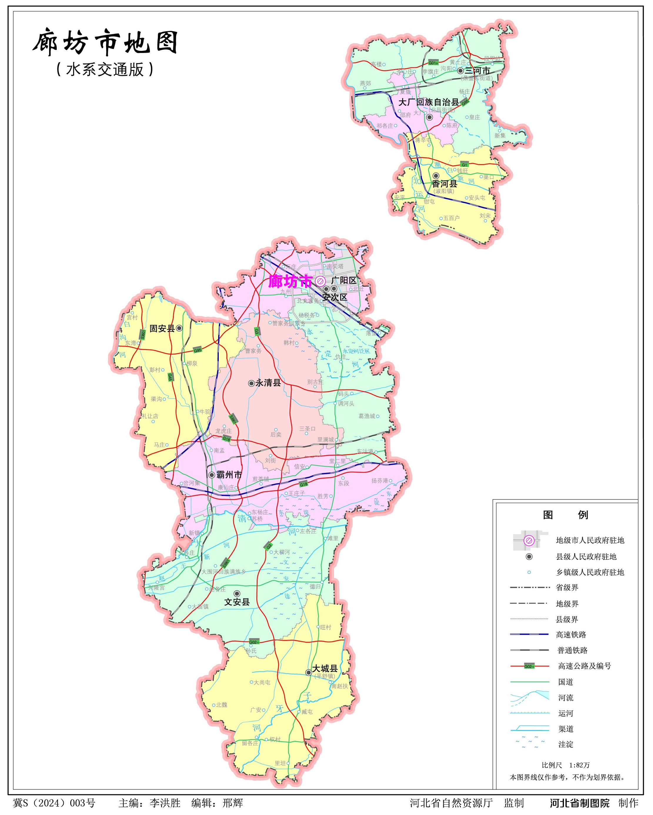 廊坊市轄2個(gè)市轄區(qū)、5個(gè)縣、1個(gè)自治縣,代管2個(gè)縣級市: