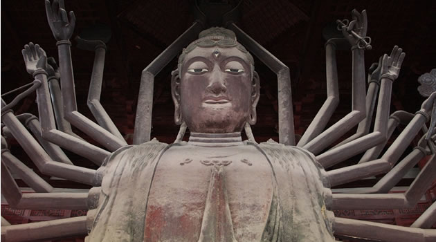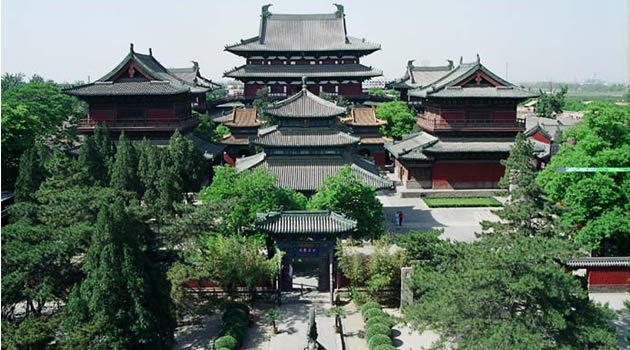 隆興寺:位于石家莊市正定縣縣城,是國內(nèi)現(xiàn)存時代較早、規(guī)模較大而又保存完整的佛教寺院之一。隆興寺始建于隋開皇六年(586年),原名“龍藏寺”。宋初,太祖祖趙匡胤敕令在龍藏寺內(nèi)鑄造銅佛,并蓋大悲閣,遂大興土,以大悲閣為主體的一組宋代建筑先后告成。到了清康熙、乾隆年間,又兩次大規(guī)模維修和增建,寺院發(fā)展到鼎盛時期。清康熙四十八年(1709),改龍藏寺為隆興寺,俗稱大佛寺。 隆興寺這座千年古剎,歷代帝王曾多次到此巡境幸駐蹕,上香禮佛,題詩書匾,刻碑立石?梢姰斈赀@里晨鐘暮鼓,鐘磬齊鳴,香煙繚繞,“南無”聲聲的歷史盛況。大悲閣是隆興寺的主體建筑,五檐三層,高33米。閣內(nèi)正矗立著高大銅佛鑄像,這就是名聞遐邇的正定大菩薩。這尊千手千眼觀音菩薩像有22.28米高,有42臂分別執(zhí)日、月、凈瓶、寶杖、寶鏡、金剛杵等法器。面部情端祥恬靜,仁慈莊重。達到了瞻之彌高、仰之益恭的藝術(shù)效果。