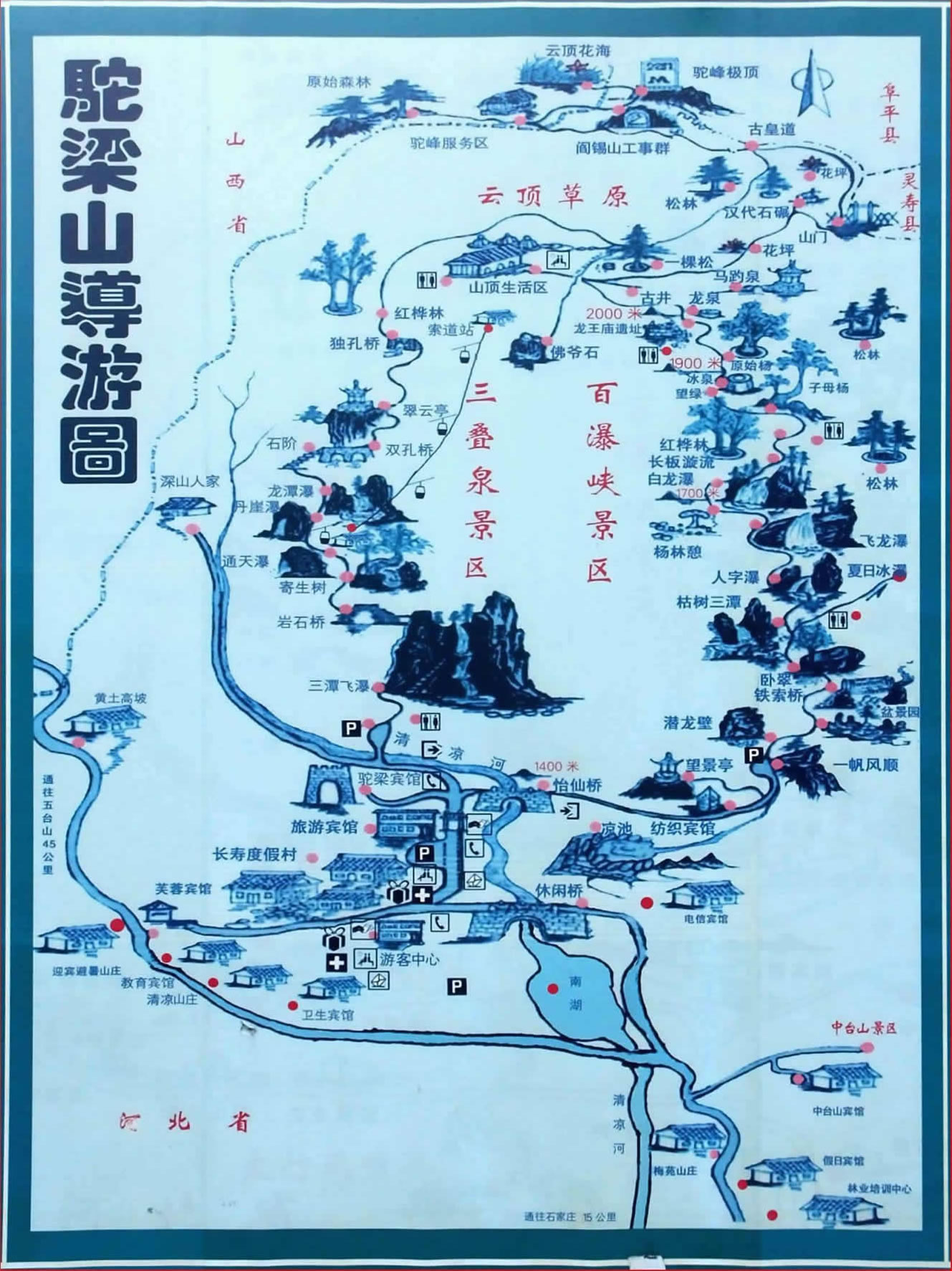 駝梁是連接西柏坡和五臺(tái)山圣地最便捷的中轉(zhuǎn)景區(qū)。來(lái)這里旅游不僅能充分領(lǐng)略大自然的韻律和景致,盡情體驗(yàn)典型的太行民俗風(fēng)情,還可留宿山莊內(nèi)賓館、高檔別墅或長(zhǎng)壽度假村,品位特有的綠色食品莜面、烙餅、大鍋菜,是舉辦居家游情侶游、科考游、生態(tài)游等和登山游等避暑覽勝的極佳去處。