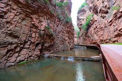 峽長4000米,一般寬1到2米,最窄處只有十幾厘米,壁高150米,這里紅巖絕壁,險峰對峙,黃巢曾在此聚兵起義,抬頭仰望,青天一線,俯視腳下,水流不斷,相隔不遠便有一道瀑布,溪水清澈見底,清涼透骨。