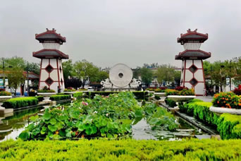 即趙苑的北大門,為一組仿秦漢風(fēng)格的建筑,兩側(cè)是門闕。中間雕塑造型為當(dāng)時(shí)名揚(yáng)列國的趙國名寶“和氏璧”。據(jù)史書記載,此玉放在暗處自然有光,不沾灰塵,能避邪,放在身邊,冬暖夏涼,百步之內(nèi),蚊蠅不人,有諸多神異之處,難怪秦王愿以十五座城池來換它,可想它的神奇和價(jià)值。和氏璧上面的八個(gè)篆字“受命于天,既壽永昌”。相傳是秦朝丞相李斯所書。整個(gè)大門莊重典雅,氣勢恢宏。