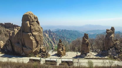 山海寺景區(qū)是祖山的中心景區(qū),下山可觀瀑布,上山可登主峰,西去可游“花果山”,東行可觀“畫廊谷”。這里景點比較集中,有仙女云床、秀才觀榜、山字峰、醉臥劉伶、龜兔賽跑、窟窿山、神龜深海、蓮花出水等奇石美景!跋膳拼病庇蓛蓚連體冰臼組成,似美女睡臥之跡,勘稱世界奇觀;“秀才觀榜”恰似秀才在榜前尋名;“飛天谷”長約十里,兩岸奇峰美石依次排開,流于谷中如觀畫廊。
