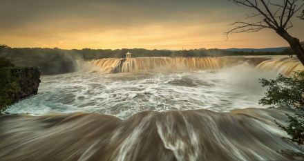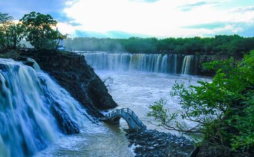 吊水樓瀑布位于鏡泊湖北頭。是景區(qū)的特級(jí)自然景源(世界級(jí)),酷似聞名世界的“尼亞加拉大瀑布”。平水期時(shí),瀑布一般幅寬五六十米,落差十二米。但在汛期,最高落差僅十余米,瀑布最大幅寬可達(dá)四百余米,從南、西、北三個(gè)方向以排山倒海之勢(shì)從熔巖壁頂直撲黑龍?zhí)。似浮云堆雪,白霧四濺,百米之外,水珠鋪面;又似銀河倒掛,彩練懸崖,奔騰咆哮,聲如奔雷。與貴洲的黃果樹瀑布、黃河壺口瀑布、九寨溝諾日朗瀑布、臺(tái)灣的文龍瀑布、廬山的三疊泉瀑布并稱中國六大名瀑。