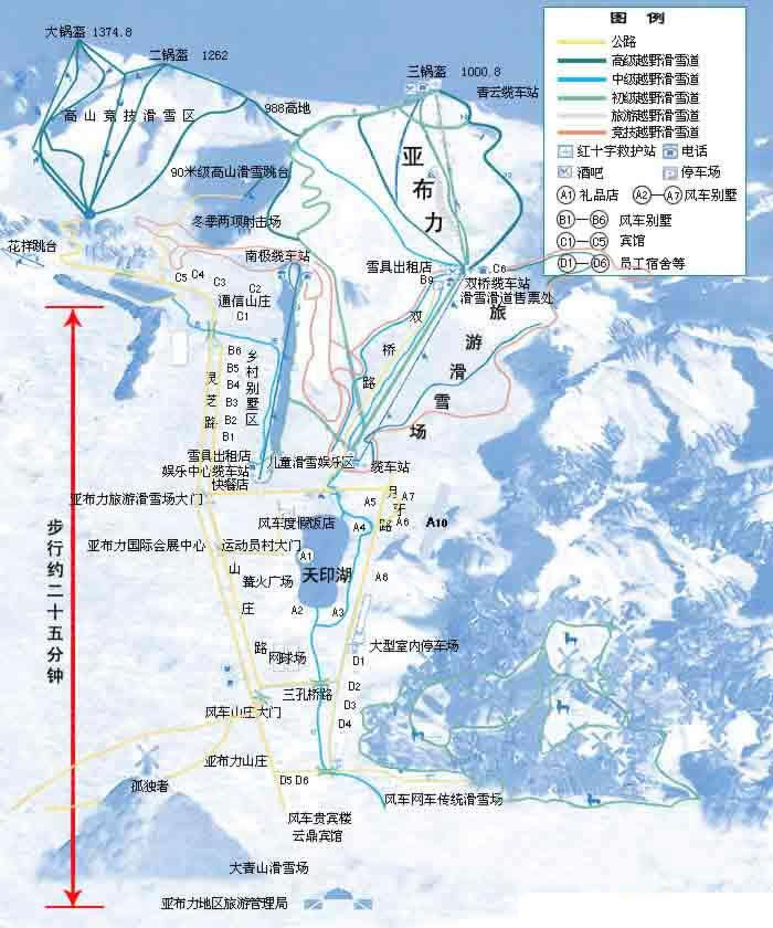 亞布力滑雪旅游度假區(qū)由具有國際標準的高山競技滑雪區(qū)和旅游滑雪區(qū)兩大部分組成,占地面積22.55平方公里。在大鍋盔(海拔1374米)、二鍋盔(海拔1262米)和二鍋盔與三鍋盔之間的海拔988米高地處修建了具有國際標準的高山競技滑雪場,有9條高山滑雪道,7條越野滑雪道,6條滑雪纜車和花樣跳臺,90米級高山跳臺,冬季兩項靶場及室內(nèi)體育館、運動員村等場地。在三鍋盔(海拔1000.8米)建成了大型旅游滑雪場,擁有l(wèi)l條高、中、初級滑雪道,總長度30公里,其中有長5公里的5號雪道,l條5公里長的環(huán)形越野滑道,2公里長的全墊升氣墊船、雪地草地摩托及雪橇專用道,3條雙人吊椅式旅游纜車索道和3條拖牽式旅游索道。