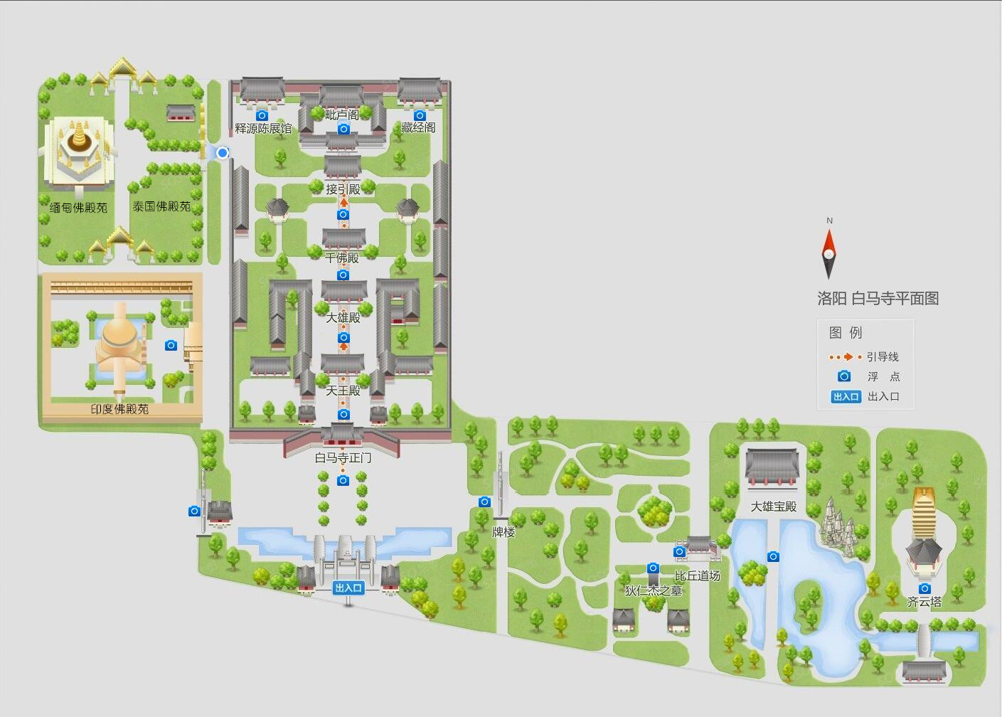 佛殿位于由南到北的中軸線上,從前到后依次分布著山門、天王殿、大佛殿、大雄殿、接引殿、清涼臺和毗盧閣等主要建筑。其中,天王殿為高臺歇山式建筑,初建于元代,明代重建,東西面闊5間,南北進深3間,殿內(nèi)正中安置著從故宮運來的雕龍貼金佛龕,內(nèi)供明代“夾纻”大肚彌勒像像、四大天王像、韋馱天將像等;大佛殿始建于元代,明代重建,后又多次修葺,高臺歇山式建筑,雙下昂六鋪作斗拱。東西面闊5間,南北進深3間,是寺院佛事活動場所,也是僧人早晚課誦的地方。內(nèi)供釋迦佛、文殊、普賢二菩薩,迦葉、阿難二弟子、供養(yǎng)天人、觀世音菩薩等塑像。懸掛于大佛殿內(nèi)東南角的大鐘鑄于明代嘉靖三十四年(1555年),通高1.65米,重二千五百斤;大雄殿始建于唐宋,元代重建,明代改建,為高臺懸山式建筑,東西面闊5間,南北進深3間,內(nèi)供釋迦、阿彌陀、藥師“三世佛”,韋馱、韋力二天將,十八羅漢等23尊元代夾纻造像,韋力天將泥塑像等;接引殿原為明代建筑,清同治年間(1862—1874年)毀于大火。光緒年間(1875—1908年)重建,硬山式,面闊3間,進深2間,內(nèi)供阿彌陀佛及觀世音、大勢至二菩薩像;清涼臺在白馬寺的最后部,是一座磚砌的高臺,東西長42.80米,南北寬32.40米,高約6米,雄渾古樸,蔚為壯觀;毗盧閣,高聳豎立于清涼臺上,是白馬寺最后一座大殿,面闊5間,進深4間,長17.03米,寬11.7米,高約15.5米,殿頂為重檐歇山式,內(nèi)供毗盧佛、文殊、普賢二菩薩。