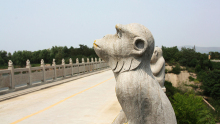 百猴橋,全長107米,壩高15.2米,為16孔15阻攔水壩式景觀橋,護欄共有石猴130個,故名百猴橋。