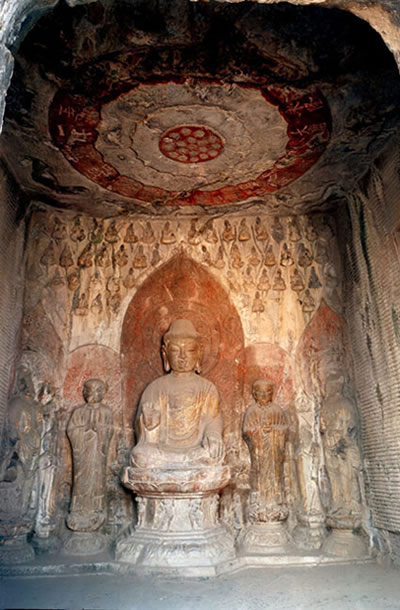 至東魏末50多年的營(yíng)造,表現(xiàn)出列多的中國(guó)藝術(shù)形式,大佛姿態(tài)也由云崗石窟的雄健可畏轉(zhuǎn)變?yōu)辇堥T(mén)石窟的溫和可親。以賓陽(yáng)中洞主佛為代表的佛像,人物面部含著微笑,龍門(mén)石窟比云崗石窟表現(xiàn)出更多的中國(guó)藝術(shù)佛像。