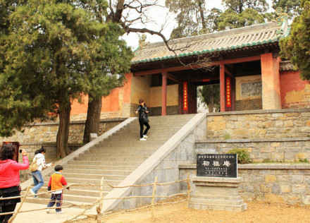 塔林北約一公里為初祖庵。它是河南省遺存文物中最古老的一 座木結構建筑,是為紀念達摩面壁而修建的。殿的檐柱、內柱、墻下雕石以及神臺周圍都有浮雕。大殿神龕內供著達摩祖師像。