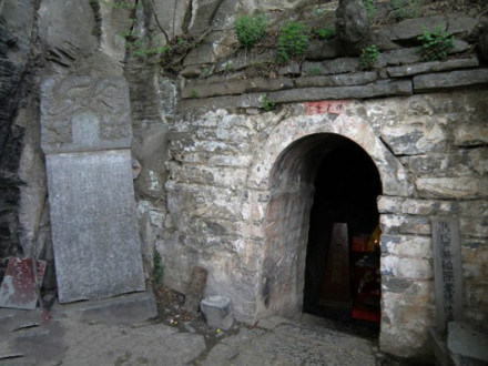 五乳峰上達摩洞深約7米,高寬3米余,北額有燕都近溪題刻“東來肇跡”。洞內石壁上,遺有高1米多、寬約60厘米的凹槽,即是當年挖鑿達摩面壁石的痕跡。內供有達摩及其弟子的石像四尊。洞外,洞外有石坊,明萬歷甲辰年(1604年)造,雙柱石砌,南額胡斌題刻“默玄處”。傳說達摩曾在此面壁十年,由于功夫深厚,他的身影形狀被印在山石上,留下了極富傳奇色彩的“達摩影石”。