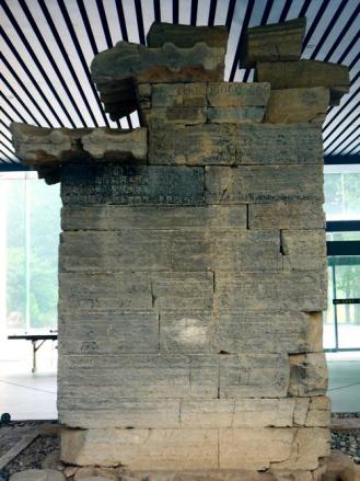 闕身用長方形石塊壘砌而成,共砌成八層,闕的上部用巨石雕砌成四阿頂,南面刻有“中岳太室陽城”六個(gè)篆字,西闕有隸篆參半的銘文,記述造闕的經(jīng)過,上書“元初五年四月陽城□長左馮詡?cè)f年呂常始造作此石闕”等字。闕身四面用減地平雕的雕刻方法刻出了人物、車馬出行、馬技、劍舞以及動(dòng)物等畫像五十余幅,再現(xiàn)了漢代貴族的生活場(chǎng)面,為今天的研究提供了很好的實(shí)物材料。