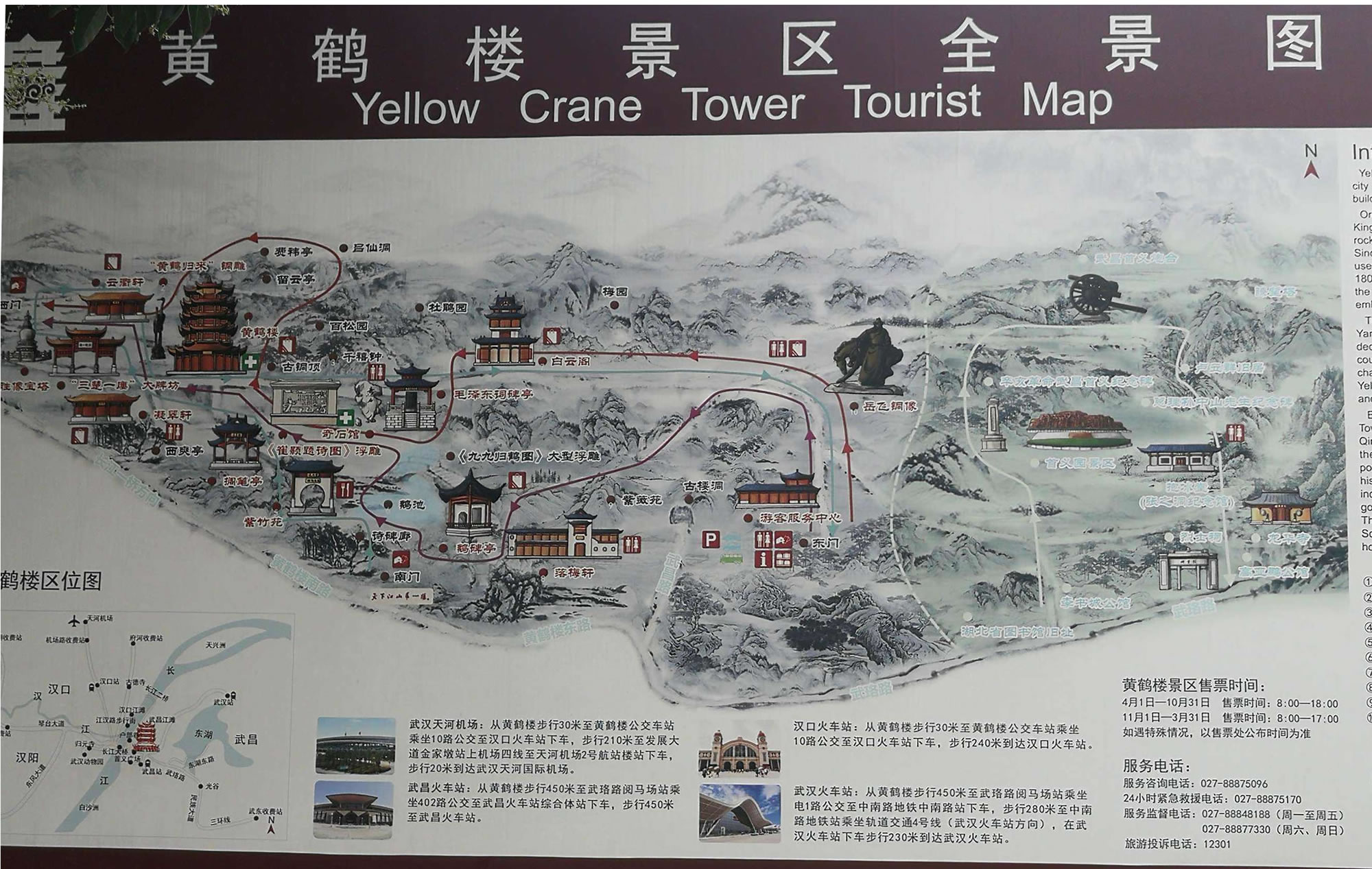 塔、碑廊、山門等建筑。整個(gè)建筑具有獨(dú)特的民族風(fēng)格。黃鶴樓內(nèi)部,層層風(fēng)格不相同。底層為一高大寬敞的大廳,其正中藻井高達(dá)10多米,正面壁上為一幅巨大的“白云黃鶴”陶瓷壁畫,兩旁立柱上懸掛著長(zhǎng)達(dá)7米的楹聯(lián):爽氣西來,云霧掃開天地撼;大江東去,波濤洗凈古今愁。二樓大廳正面墻上,有用大理石鐫刻的唐代閻伯瑾撰寫的《黃鶴樓記》,它記述了黃鶴樓興廢沿革和名人軼事;樓記兩側(cè)為兩幅壁畫,一幅是“孫權(quán)筑城”,形象地說明黃鶴樓和武昌城相繼誕生的歷史;另一幅是“周瑜設(shè)宴”,反映三國(guó)名人去黃鶴樓的活動(dòng)。三樓大廳的壁畫為唐宋名人的“繡像畫”,如崔顥、李白、白居易等,也摘錄了他們吟詠黃鶴樓的名句。四樓大廳用屏風(fēng)分割幾個(gè)小廳,內(nèi)置當(dāng)代名人字畫,供游客欣賞、選購(gòu)。頂層大廳有《長(zhǎng)江萬里圖》等長(zhǎng)卷、壁畫。
