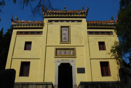 又名武侯宮,坐赤壁山東南處的南屏山頂,是為了紀念在三國演義描述的赤壁之戰(zhàn)中,諸葛武侯在此“設(shè)壇臺、借東風(fēng)、相助周郎”而建造的。整個建筑面積有310平方米,分前后兩殿廟堂,內(nèi)殿供有劉備、關(guān)羽、張飛、諸葛亮的全身塑像,袍帶飄逸,栩栩如生。左側(cè)有文物陳列館,建于1979年,館內(nèi)陳列赤壁出土文物1000余件,有刀、槍、劍、戟、鏃、戈、帶鉤及東吳銅幣(“大錢當(dāng)千”、“大泉五百”、“大泉當(dāng)百”),并有東漢銅鏡和“剪輪五銖”錢及大量東漢、三國時的陶器等。右側(cè)“東風(fēng)閣”于1975年建造,供游人歇憩。今拜風(fēng)臺系1935年重建,1948年維修。