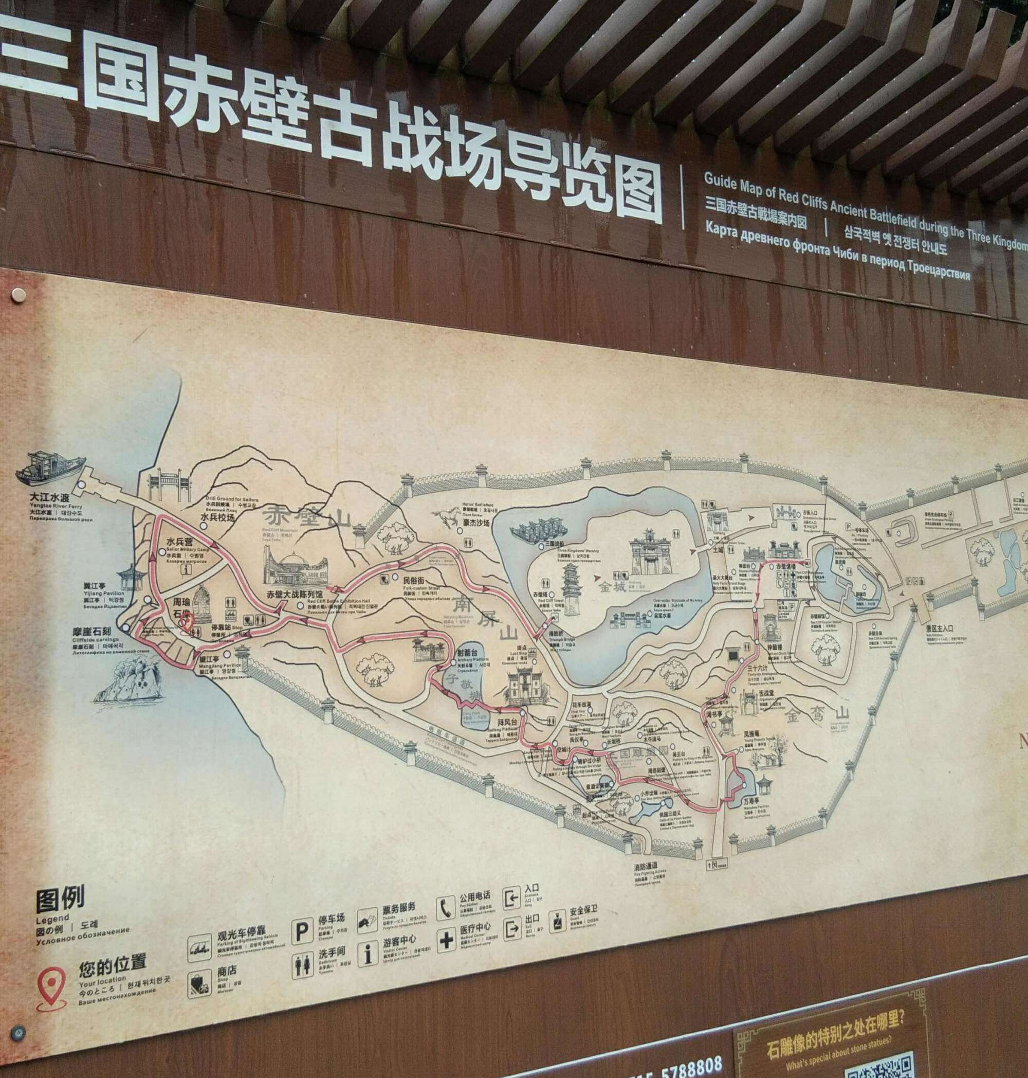 其主要景觀有:赤壁摩崖石刻、周瑜塑像、拜風(fēng)臺、鳳雛庵、翼江亭、赤壁大戰(zhàn)陳列館、赤壁碑廊、千年銀杏、三國雕塑園等。