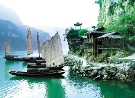 三峽人家,依山傍水,風情如畫:傳統(tǒng)的三峽吊腳樓點綴于山水之間,久違的古帆船、烏篷船安靜地泊在三峽人家門前,溪邊少女揮著棒槌在清洗衣服,江面上悠然的漁家在撒網(wǎng)打魚……千百年來流傳不衰的各種習俗風情體現(xiàn)著峽江人民的質(zhì)樸好客。