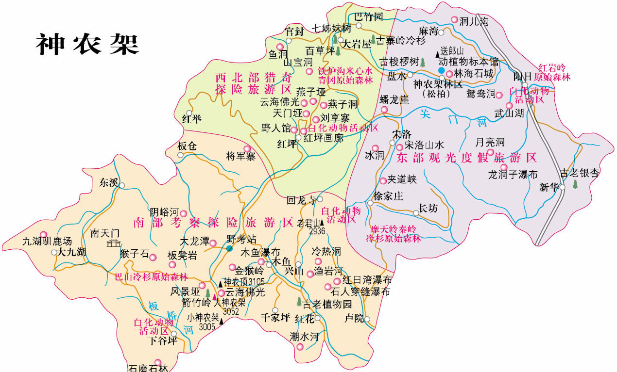 神農(nóng)架是位于湖北省西部一片群峰聳立的高大山地,橫亙于長江、漢水之間,方圓3250平方公里,相傳因上古的神農(nóng)氏在此搭架上山采藥而得名。景區(qū)山峰均在海拔3010米以上,堪稱“華中屋脊”。是以秀綠的亞高山自然風光,多樣的動植物種,人與自然和諧共存為主題的森林生態(tài)旅游區(qū)! 神農(nóng)架主要景點有神農(nóng)頂、風景埡、板壁巖、瞭望塔、小龍?zhí)丁⒋簖執(zhí)、金猴嶺等,以原始、神秘聞名于世,區(qū)內山高谷深,林木茂密,氣候復雜多變,四季景色迷人。獨特的自然環(huán)境、人文歷史,造就了極其豐富、珍貴的自然和人文景觀,也孕育了景色宜人、鐘靈毓秀的旅游環(huán)境,有“神農(nóng)天園”之稱。