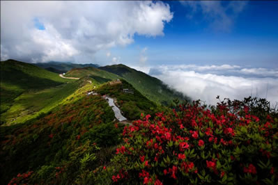 大圍山海拔1200米處上下有連綿數(shù)十里的高山杜鵑。紅的、黃的、紫的交相輝映。