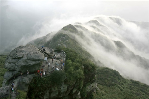 祝融峰是衡山的最高峰,是中國(guó)紀(jì)念人文祖先祝融氏的山峰!白H诜逯摺睘槟显里L(fēng)光“四絕”之首。由于常年煙云的烘托和群峰的疊襯,加之它矗立于地勢(shì)相對(duì)低洼的湘南盆地之中,更顯得它峻極天穹。在古語(yǔ)中“!笔浅志糜肋h(yuǎn)之意,“融”是光明之意,“祝融”是永遠(yuǎn)光明。唐代大文豪韓愈在《游祝融峰》詩(shī)中贊嘆道“萬(wàn)丈祝融拔地起,欲見(jiàn)不見(jiàn)輕煙里”。北宋黃庭堅(jiān)寫道:“萬(wàn)丈祝融插紫霄,路當(dāng)窮處架仙橋。上觀碧落星辰近,下視紅塵世界遙!贝颂帪閿埲悍,看日出,觀云海,賞雪景的最佳去處。