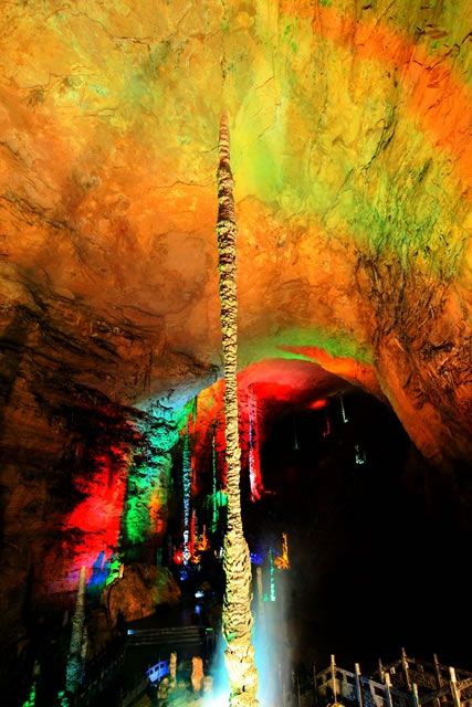 雪松是龍宮的第三大奇觀,也是黃龍洞內(nèi)生長(zhǎng)速度最快的一根石筍,它通體雪白,高達(dá)17米,巍然聳立在龍宮大廳西端的斜坡上,“大雪壓青松,青松挺且直”就是它的真實(shí)寫照!把┧伞钡目茖W(xué)名稱叫棕櫚狀石筍,是洞頂?shù)嗡捌洚a(chǎn)生的飛濺水共同作用的結(jié)果,一般只有在空間較為高大的廳堂才能看到。根據(jù)其根部的棕櫚片取樣分析,“雪松”挺立在這里已經(jīng)有9.6萬年的時(shí)間了,因此也叫它“萬歲松”。