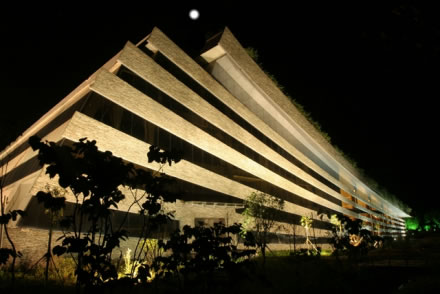黃龍音樂廳位于生態(tài)廣場(chǎng)入口處,由黃龍洞投資股份有限公司按國(guó)際標(biāo)準(zhǔn)建設(shè),建筑面積為4970平方米,總投資1.6億元,座位818個(gè)。該音樂廳背靠植被茂盛的黃龍洞山體,面朝浩瀚的稻田,南鄰潺潺東流的索溪水。整個(gè)建筑為框剪式結(jié)構(gòu),3250平方米斜坡面屋頂全部為綠茵花草屋蓋,是全球最大的綠化屋頂;其外墻由當(dāng)?shù)厍嗍搸r構(gòu)建成的音符弦線幕墻與自然融合一體,形如一本即將展開等待世人閱讀的張家界文化寶典,又如鑲嵌在張家界的一塊翡翠,被譽(yù)為“世界環(huán)境最美音樂廳”。