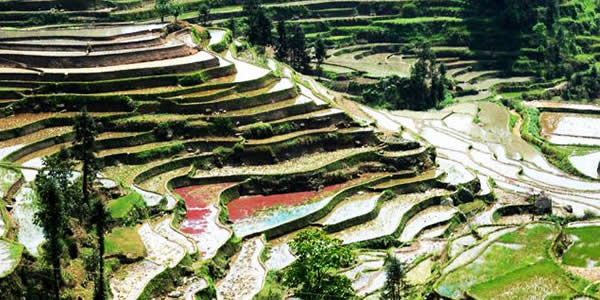 紫鵲界梯田位于新化縣西部山區(qū)水車鎮(zhèn)境內(nèi),她周邊的梯田達(dá)8萬余畝以上,其地勢(shì)之高,規(guī)模之大,形態(tài)之美,堪稱世界之最。紫鵲界生態(tài)環(huán)境優(yōu)美,梯田密集,形態(tài)原始,阡陌縱橫,線條流暢,山高水長,板屋交錯(cuò),充分展示出梯田的自然美、古樸美、形體美、文化美。尤其是隨著四季氣候的變化,使紫鵲界梯田更加婀娜多姿,如臨人間仙境。水奉公路盤旋于這些梯田之間達(dá)十余公里,梯田遍布于海拔500米至1000余米的十幾個(gè)山頭上,最大的不過1畝,最小的只能插幾十蔸禾,連綿起伏,輾轉(zhuǎn)盤旋,可謂是儀態(tài)萬方,令人贊嘆不已。據(jù)調(diào)查,紫鵲界梯田成型已有2000余年歷史,是苗、瑤、侗、漢等多民族