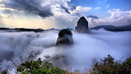 武岡云山,云山,湘西南名山,屬雪峰山余脈,以云多奇幻而得名。位于武岡市城南5千米處,東西綿延數(shù)十里,毗連著武岡、新寧、城步三縣疆界。最高峰海拔1372.5米,為國家級森林公園和國家3A景區(qū)。分伴山?jīng)_、云山堂、紫霄峰幾大景區(qū),景區(qū)中云海、古樹、流泉、溪澗、瀑布、幽谷、山峰、怪石、古剎、靈寺、古道、古跡一應(yīng)俱全,被譽為"楚南勝地"。始建于三國吳國時勝力寺,寺廟面積2500平方米,寺內(nèi)有彌勒殿、大雄寶殿、觀音殿等,建筑完好,為湘西南著名的宗教文化活動場所和游覽勝地。1982年被列為國家自然保護區(qū),1992年9月經(jīng)原國家林業(yè)部批準建立國家級森林公園。