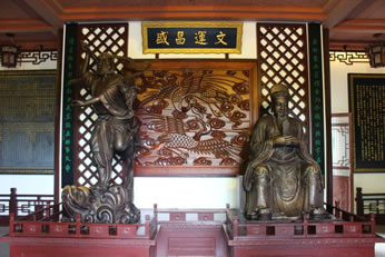 在這兩尊神像的兩邊石柱牌匾上刻有曾國藩題寫的對聯(lián):上聯(lián)是“垂訓意無窮,爍古炳今,總不外綱常名教”;下聯(lián)是:“讀書期有用,居仁由義,豈徒在科第文章”。從曾國藩的這幅對聯(lián)可以看出,在當時歷史環(huán)境下,不經(jīng)過科舉,士子們是不可能獲得一官半職和有所作為的;而要獲取功名,還得靠自己讀書的刻苦和對綱常名教的執(zhí)著。上方題有“文運昌盛”四字牌匾,預示著湖南人杰地靈,文運昌盛,更是人才輩出的地方。展示廳右邊墻面青石板上刻有“歷代湖南狀元名錄”,左邊刻有“歷代長沙進士名錄”和“明清長沙府著名科舉人才名錄”,細心的游客朋友都會發(fā)現(xiàn),湖南歷朝歷代金榜題名考中狀元者只有15人,而考中進士之人達1300人以上,同時,位居顯赫,大有作為之人均在進士之中!