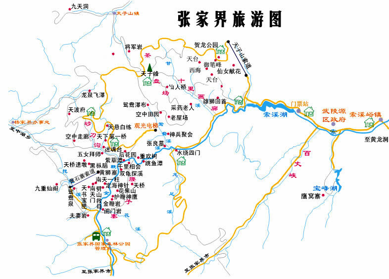 張家界市旅游資源非常豐富,景區(qū)、景點繁多。有中國第一個國家森林公園 張家界國家森林公園;索溪峪自然保護區(qū);天子山自然保護區(qū);中國首批20個國家級自然保護區(qū)之一、中國生物圈保護區(qū)網(wǎng)絡(luò)首批45個網(wǎng)絡(luò)成員之一的湖南八大公山國家級自然保護區(qū);天門山國家森林公園;省級風(fēng)景名勝區(qū)天門山、茅巖河風(fēng)景名勝區(qū);"地下明珠"黃龍洞;"人間瑤池"寶峰湖;被譽為世界溶洞之奇、亞洲第一洞的九天洞;"江南名剎"普光禪寺;土家人的"圣地"土家風(fēng)情園;"道教勝地"五雷山;賀龍紀(jì)念館、紅二方面軍長征出發(fā)地、湘鄂川黔革命根據(jù)地紀(jì)念館等革命紀(jì)念地等等。
