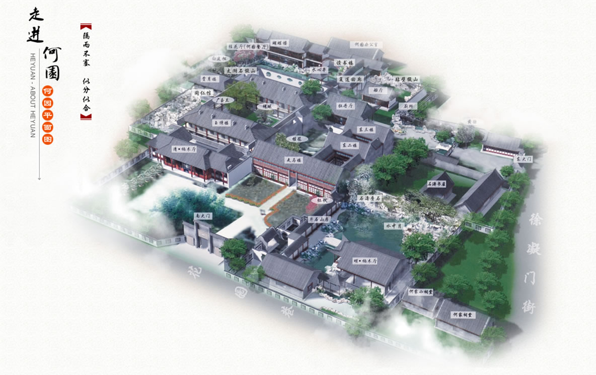 何園全園分為東園、西園、園居院落、片石山房四個(gè)部分,片石山房在東園南面,園居院落則被東園、西園和片石山房包圍,其園內(nèi)的兩層串樓和復(fù)廊與前面的住宅連成一體。