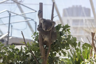 考拉館占地面積1400平方米,建筑面積600平方米,內(nèi)展廳、外展區(qū)、陽光溫室展區(qū)、體檢區(qū)、動物隔離治療區(qū)、桉樹冷藏室、桉樹處理區(qū)、人員進出消毒池和更衣區(qū)和游客互動體驗區(qū)等功能區(qū)俱全。展廳具有溫度、濕度控制系統(tǒng),游客區(qū)和考拉生活區(qū)兩套完全獨立的新風(fēng)系統(tǒng)進行環(huán)境控制,確保游客面空氣循環(huán)與考拉籠舍空氣循環(huán)不交叉。
