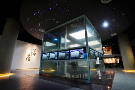 數(shù)字館位于民國館北側(cè)地下,由實(shí)體展館和網(wǎng)絡(luò)虛擬館構(gòu)成。實(shí)體館約1200平方米,用抽象概念輔以歷史事實(shí)的表現(xiàn)方式詮釋中華文明發(fā)展歷程,總體風(fēng)格時(shí)尚亮麗。突破“以展柜和展板為主”的傳統(tǒng)展陳方式,采取“不封死、不看穿”錯(cuò)層交疊的空間構(gòu)建手段,集合分列式多屏幕、透明屏、二維碼等多媒體形式,運(yùn)用實(shí)時(shí)摳像、動(dòng)作捕捉等數(shù)字技術(shù),將空間、裝飾、媒體硬件及數(shù)字內(nèi)容結(jié)合起來,營造立體豐富的展示環(huán)境,引導(dǎo)觀眾沿著流線移步換景。網(wǎng)絡(luò)虛擬館通過網(wǎng)絡(luò)和圖像識(shí)別技術(shù)復(fù)原實(shí)體展館的空間和內(nèi)容,是實(shí)體展館的延伸。以網(wǎng)絡(luò)為平臺(tái),觀眾自己制作的展示內(nèi)容,通過遴選的,也可推送到實(shí)體展館。實(shí)體展館分為六大展區(qū),序廳:以《時(shí)光》為題,通過流水、風(fēng)沙、變幻的星空,體現(xiàn)“時(shí)間”對于人類文明的獨(dú)特作用,營造時(shí)間飛逝,萬物滄桑的情境感。萌動(dòng)與發(fā)軔:用獨(dú)具風(fēng)格的影像勾勒出初生的人類試圖征服自然時(shí)表現(xiàn)出的勇氣與“傻氣”。進(jìn)取與成長:體現(xiàn)中華文明的快速發(fā)展。用歷史故事表現(xiàn)“熱血青年”、“因?yàn)閻矍椤、“君子愛?cái)”、“意氣風(fēng)發(fā)”等人生路上的喜怒哀樂。擴(kuò)張與融合:用立面寬12.5m,高5.9m的C形巨幕影片,以戰(zhàn)爭、帝國故事表現(xiàn)人類進(jìn)步過程中的豪邁激越、堅(jiān)韌不拔以及全盛時(shí)期的聲色犬馬、宗教宣揚(yáng)。封閉與開放:截取閉關(guān)鎖國、鴉片戰(zhàn)爭、文明絲路中的歷史片段,表現(xiàn)中華文明從開拓進(jìn)取逐漸轉(zhuǎn)向內(nèi)斂、保守、固步自封的心態(tài)。生命因你永恒:總結(jié)在初生、發(fā)展、強(qiáng)盛、衰落這一螺旋式漸進(jìn)的歷史進(jìn)程中,文化和民族產(chǎn)生了融合,政治制度、科學(xué)技術(shù)和文化藝術(shù)也在不斷成熟、進(jìn)步,文明向更加美好和睿智的方向前進(jìn)。