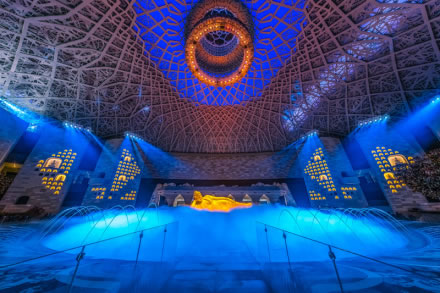禪境大觀,南北長(zhǎng)112米,東西寬62米,內(nèi)部?jī)舾呒s41.2米,涵蓋了地上三層。整個(gè)空間面積超過(guò)6000㎡,呈橢圓形,以黃、白、灰三色為基調(diào),布置出人間山水,從而讓人們?cè)谛凶咧H領(lǐng)略禪意。由佛陀出生、成道的禪境花園及中間的如蓮劇場(chǎng)三個(gè)部分組成,展現(xiàn)了佛祖一生的行跡。