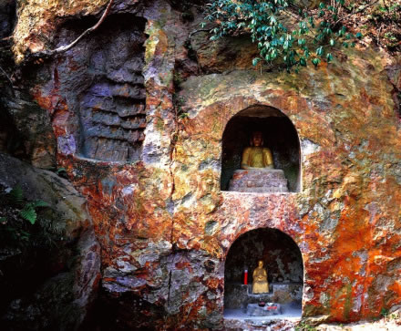 明代摩崖石刻,位于牛首山東峰兜率巖北崖,距離弘覺寺塔約一百米,旁邊是羅漢泉。石刻整體呈“幾”字形,三面巖石南北長(zhǎng)11.5m,東西寬5.8-8m,中間圍合成約77平方米的平地空間。崖壁上共開鑿5個(gè)佛龕,北壁3個(gè),東壁2個(gè),共有133尊雕像。