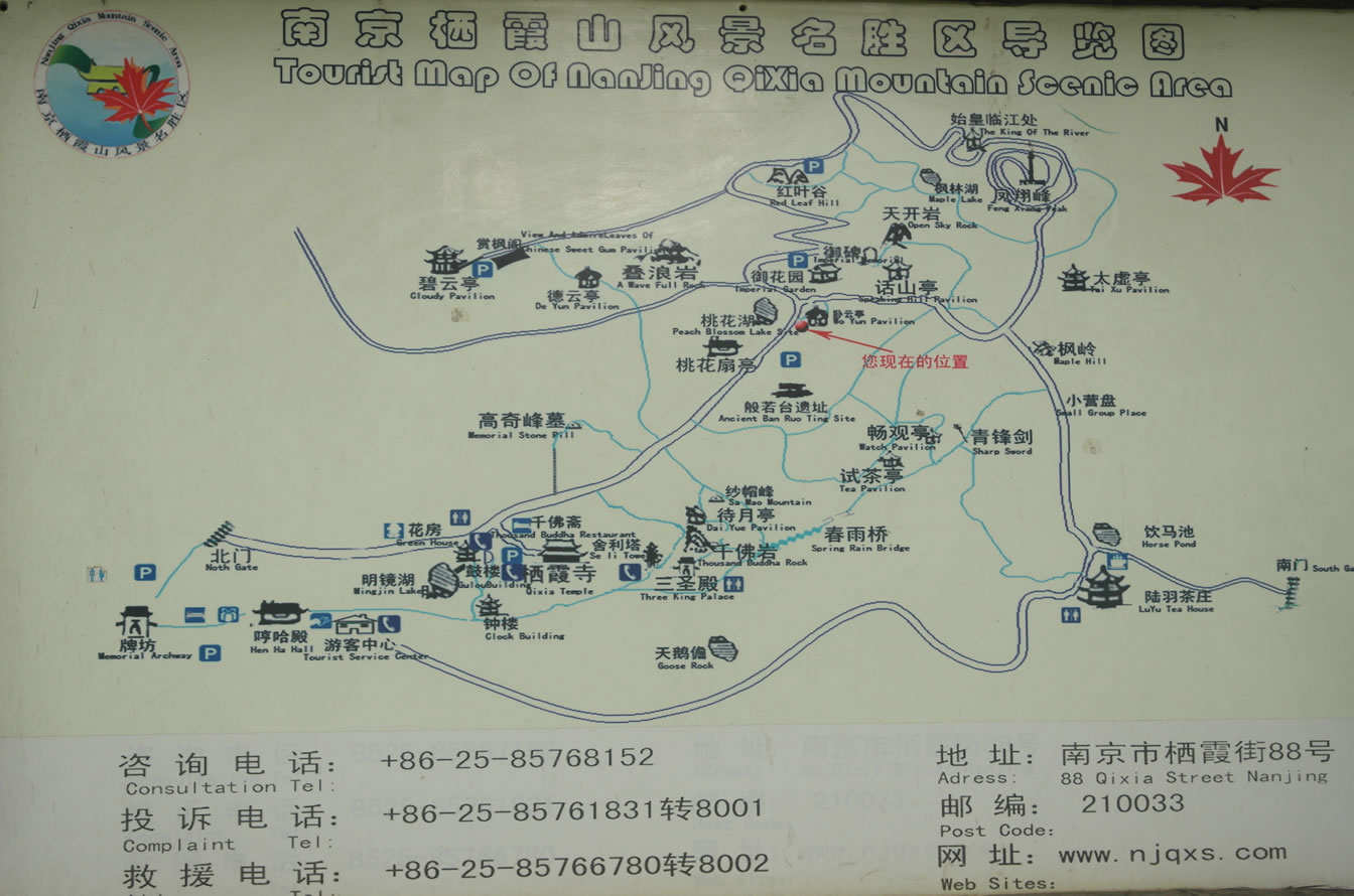 棲霞山風(fēng)景區(qū)位于南京市棲霞區(qū)中部,距太平門20公里,北臨長江,東望龍?zhí)独薰呐_,西隔九鄉(xiāng)河與南北象山隱隱相連,南為波浪起伏的低矮丘陵,總面積312.34公頃,周長約7.5公里,綠地率99.28%。山有三峰,主峰三茅峰海撥286米,又名鳳翔峰,呈圓錐狀;東北一山,形若臥龍,名為龍山;西北一山,狀如伏虎,名稱虎山。