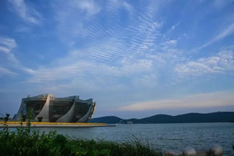 徐州水上世界,是設(shè)在湖中心的一座大型水族館,4A景區(qū)。它座落在云龍湖的湖心島上,其外形如長鯨擊水,又似白豚臥波,這個(gè)形象被制作成"錦繡中華"紫砂浮雕,鑲嵌在北京人民大會(huì)堂中央廳的墻壁上。