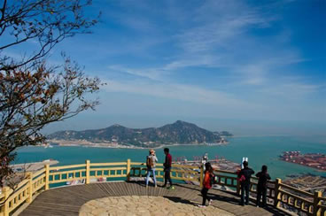 海天一覽觀景臺(tái),建于山崖頂上。依山面海,凌空壯觀,氣勢(shì)恢宏,與懸空棧道、懸索橋、云中漫步廊橋相連,總長1180米,直通二桅尖山峰。游客在此,極目海州灣,一覽港島城,山海奇觀,盡收眼底,令人心曠神怡,流連忘返。有詩贊道:“山居有大觀,圖畫入眼簾。曠目千里遠(yuǎn),怡心數(shù)縷煙。島峰浮霧海,帆影接云天。海上長虹落,銀鷗舞蹁躚”。