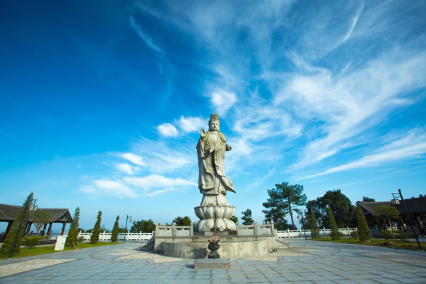 滴水觀音菩薩雕像于2007年香港回歸10周年贛粵港信眾捐建,其寶相慈祥莊嚴,左手持凈瓶,右手做法印,屹立在三百山東江的源頭。雕像總高11.69米,與主峰海拔相稱。雕像的形態(tài)、手法符合佛教的意義,具備當(dāng)今美學(xué)、建筑學(xué)、雕塑學(xué)、佛像藝術(shù)的時代特色。