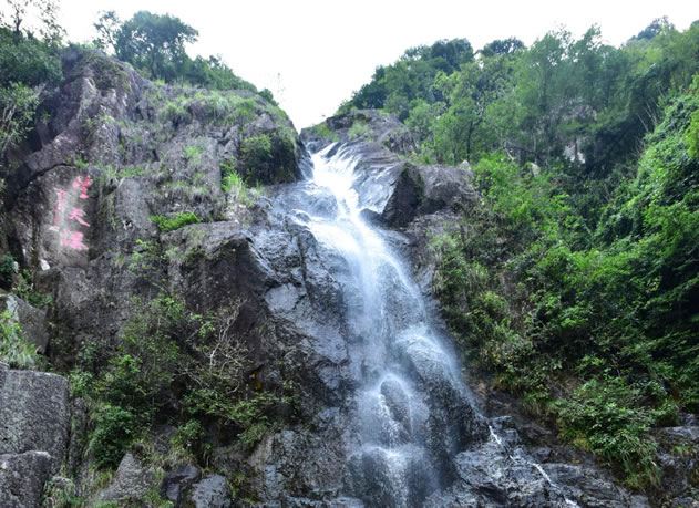 東江第一瀑由福鰲塘和山上大小溪流匯集而成,瀑布單級落差120多米,是目前景區(qū)發(fā)現(xiàn)單級落差最大的常流瀑布,氣勢雄偉,兩側(cè)峭壁凌空,古木參天。飛瀑前方視野開闊,遠處青山疊翠,林海蒼茫,令人心曠神怡。石壁上東江源三個字是由全國政協(xié)原副主席葉選平題寫。