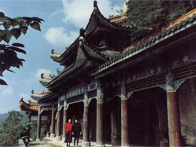 二級高臺與石作須彌座墊托的主閣渾然一體。由高臺登閣有三處入口,正東登石級經抱廈入閣,南北兩面則由高低廊入閣、正東抱廈前,有青銅鑄造的“八怪”寶鼎,鼎座用漢白玉打制,鼎高2.5米左右、