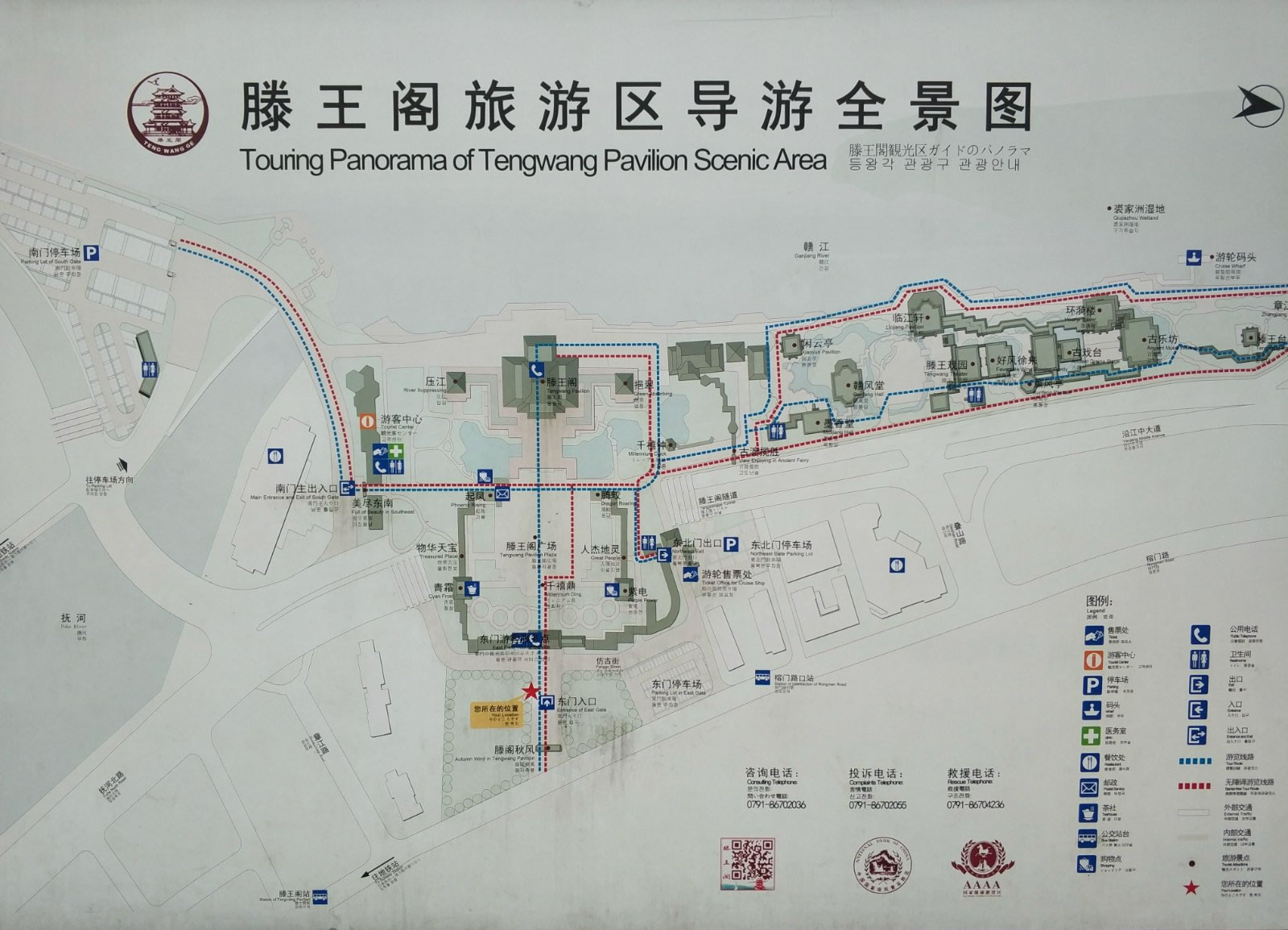 滕王閣座落于贛江與撫河故道的匯合處,占地4.3公頃,滕王閣在歷史上的興廢更迭達29次之多,現在的滕王閣主閣落成于1989年10月8日,共九層,凈高57.5米,南北配有回廊連接的兩個輔亭,建筑面積13000多平方米。瀕鄰南浦,面對西山,視野開闊,距唐代閣址僅百余米,主體建筑為宋式仿木結構,碧瓦丹柱,雕梁飛檐,氣勢頗為雄偉。