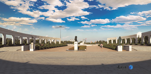 規(guī)劃采用中國傳統(tǒng)與西方造園學說和現(xiàn)代規(guī)劃理念相結合的構思,達到了自然與人文的和諧統(tǒng)一,主入口大門及兩側弧形引導墻,沿中軸線對稱布局相得益彰;不對稱的景觀廣場,運用巧妙的軸線轉折,通過拱形橋與主題雕塑遙相呼應。