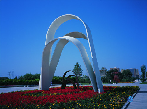 從長春世界雕塑公園的東門開始,拾級而上,就能夠到達“和平廣場”。廣場正中矗立著美國雕塑家馬克?威斯白克創(chuàng)作的“和平的延伸”。該作品由大小兩組曲面構成兩扇門的形式,跨立在大理石路面當中,形成由遠及近的視覺沖擊感,象征著和平之路的延伸,表達了人類對和平與美好的共同期盼。雕塑主體周圍有數(shù)個花壇,經(jīng)常種植紫色,黃色等多彩的草本花朵,很多攝影愛好者都選擇面向東門的方向拍攝,藍天白云與延伸感的視點,讓人感到平靜祥和。