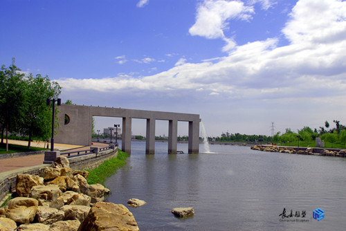 蜿蜒變化的一、二號園路,似玉帶沿碧波粼粼的湖水環(huán)繞,與四組景觀長墻巨龍般傾向湖心的噴水,形成動與靜、真與曲的韻律美。