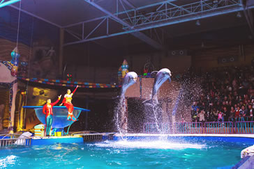 2、《海豚灣之戀》表演——圣亞“三大表演”之一,海豚、白鯨、美人魚、王子、海盜、月光天使共同主演,情節(jié)跌宕起伏,風格浪漫唯美。表演地點:夢幻海豚灣。表演時長:20分鐘左右(旺季表演前10分鐘有外國小丑互動)。