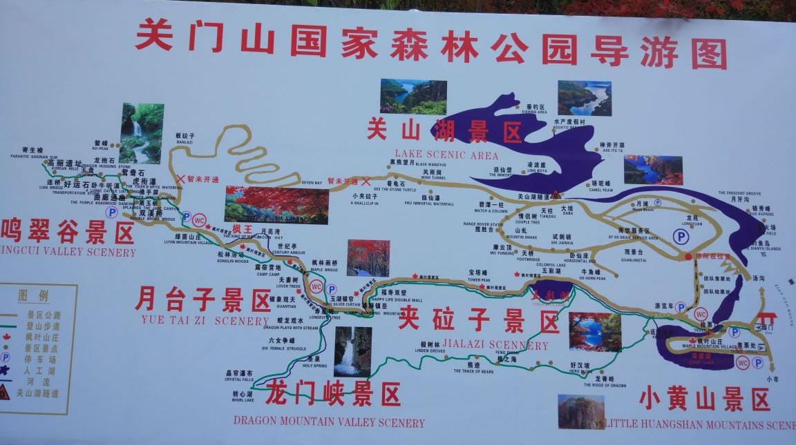 森林公園內(nèi)有四大景區(qū)小黃山景區(qū)、夾砬子景區(qū)、龍門峽景區(qū)和月臺(tái)子景區(qū),共計(jì)108處景點(diǎn)。它有三道門:北門,在小市方向,雙峰對(duì)峙,中間拱橋相連;南門,在去湯溝的嶺頂,公路從中穿過,十分險(xiǎn)要;中門,在深谷河道中,“雙扉”夾水,寬只二十余米,為興修水庫的天然門柱,有人把關(guān)門山風(fēng)景譽(yù)為“小江南”,“賽黃山”,說它有五美:山美,陡峭,俊秀,似一簇簇盆景;樹美,樹木種類繁多,特別是秋天的楓葉,冬季植根于峭壁上的蒼松,非常壯觀;水美,湯河穿過山谷,匯集小溪,飛瀑,“奪門”而出,似來自于天際;花美,天女木蘭,山杜鵑,漫山遍野;云美麗,清晨雨后,山谷中云霧繚繞,如披輕紗,分外嫵媚。歷代文人多有詩篇贊頌,許多美術(shù)工作者,經(jīng)常到這里寫生、作畫。